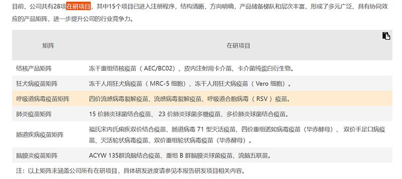 除了已上市且擁有超50%市場份額的ACYW135羣腦膜炎球菌多糖疫苗和A羣C羣腦膜炎球菌多糖結合疫苗,以及2020年批簽發數量爆發的Hib結合疫苗,智飛生物在2022年半年報中披露,在研項目共28項,其中15個項目已進入註冊程序,覆蓋預防結核病、肺炎、腦膜炎、流感、狂犬病等傳染病的人用疫苗、生物製品項目。