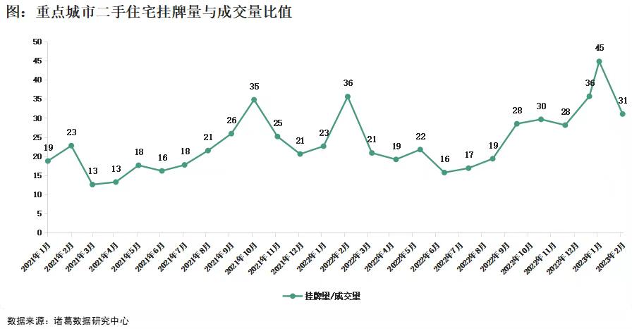 與此同時,二手房成交量大增與掛牌量居高不下現象交織並存。作爲近期以來樓市回溫的主體,二手房市場可謂是搶佔各大熱門,多城二手房帶看、成交數據亮眼。一方面是二手房成交量增加,市場行情火熱,另一方面則是二手房掛牌量並沒有因交易量的提升而減少,反而居高不下。根據諸葛數據研究中心監測數據顯示,2023年1月份重點10城二手房掛牌量與成交量的比值升至45,達到近兩年峯值,2月份隨着成交端走強,掛牌量與成交量比值降至31,但是仍處於歷史高位水平。
