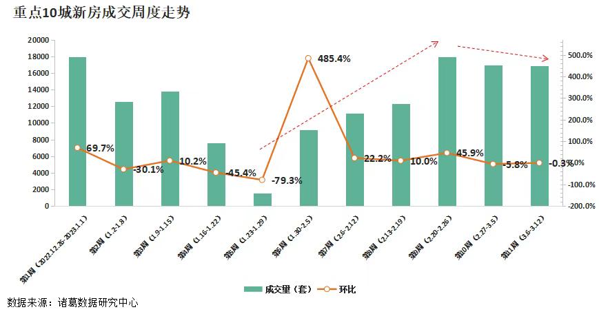 根據諸葛數據研究中心監測數據顯示,2023年第10周(2月27日-3月5日)重點10城新房成交16941套,環比下降5.77%;第11周(3月6日-3月12日)重點10城新房成交16895套,環比下降0.27%。新房成交在進入3月份後上升態勢戛然而止,近兩週連續下滑。
