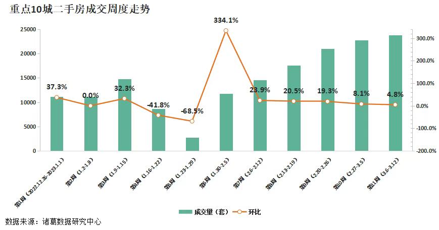二手房方面,2023年第10周(2月27日-3月5日)重點10城成交22719套,環比上升8.1%,漲幅較上週收窄11.2個百分點;第11周(3月6日-3月12日)重點10城二手房成交23810套,環比上漲4.8%,漲幅較上週收窄3.3個百分點。二手房市場復甦勢頭強於新房,3月份仍然維持漲勢,但是從周度增幅來看也在走弱,上漲動力逐漸顯露不足。