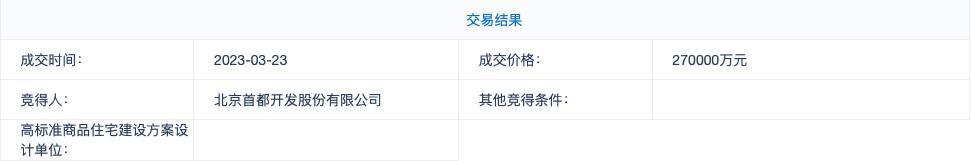 另一宗地塊爲北京昌平新城東區三期土地一級開發項目CP00-1002-0001地塊R2二類居住用地,位於昌平區南邵鎮,土地面積49176.789平方米,規劃建築面積108188.936平方米,掛牌出讓起始價爲27億元。該地塊僅收到1次網上報價,最終被首開以27億元底價拿下,成交樓面價24956元/平方米,商品住宅銷售指導價爲53000元/平方米。