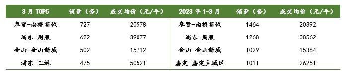 分板塊來看,3月份板塊銷量TOP5爲南橋新城、周康、金山新城、三林和嘉定主城區。今年一季度,板塊銷量TOP5爲南橋新城、周康、金山新城、嘉定主城區和三林。