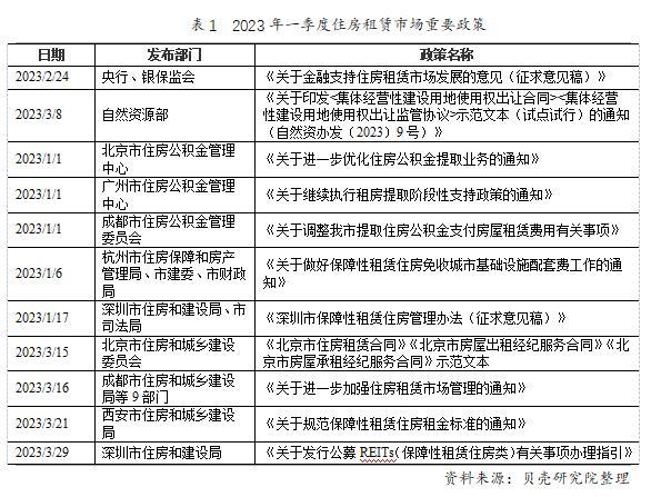 各地政策主要是供需兩端發力,通過公積金支持、完善保租房及監管政策來保障新市民租房需求。一是,加大公積金支持力度。2022年5月份住建部、財政部、人民銀行頒佈了《關於實施住房公積金階段性支持政策的通知》,明確:“合理提高住房公積金提取額度,實現更多業務務網上辦、掌上辦、指尖辦。”在此基礎上,北京、廣州、成都陸續發佈租房提取公積金支持政策,通過簡化程序、提高公積金用於租房的提取額度,進一步提升新市民、青年人的支付能力。二是完善保障性租賃住房落地政策,一季度杭州、深圳、成都和西安陸續發佈了保障性租賃住房落地指導配套政策,如杭州市住房保障和房產管理局等部門出臺了《關於做好保障性租賃住房免收城市基礎設施配套費工作的通知》,至此杭州市形成了保障性租賃住房“1+5”政策,其中“1”是指《杭州市關於加快發展保障性租賃住房實施方案》;“5”是指保障性租賃住房項目認定、租賃管理、租金管理、民用水電氣、免收城市基礎設施配套費等相關配;《深圳市保障性租賃住房管理辦法》(徵求意見稿)等保障性住房相關政策發佈,深圳保障性住房體系將從此前的以公共租賃住房、安居型商品房、人才住房爲主,調整爲以公共租賃住房、保障性租賃住房、共有產權住房爲主。三是住房租賃市場監管的持續完善。一季度北京市出臺住房租賃相關的示範文本,成都則出臺了加強市場監管的通知。