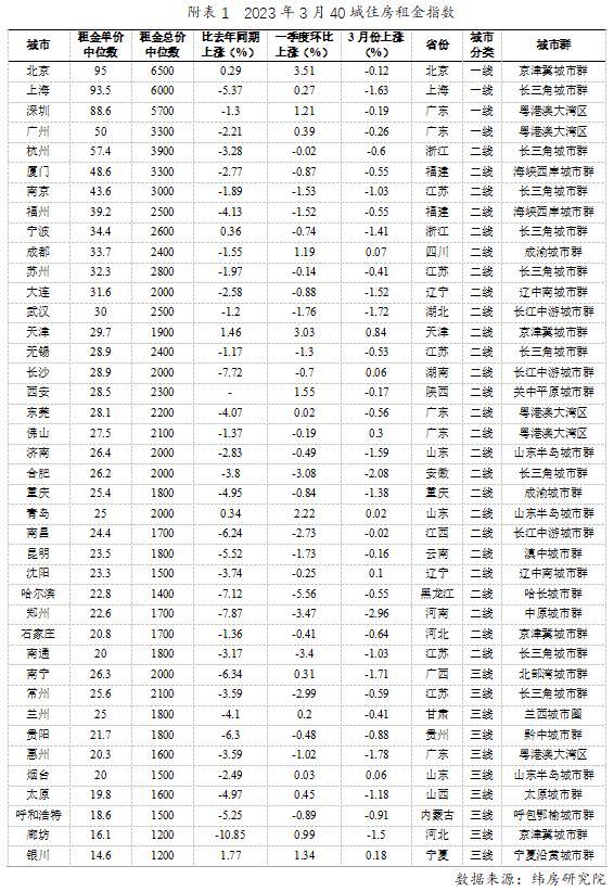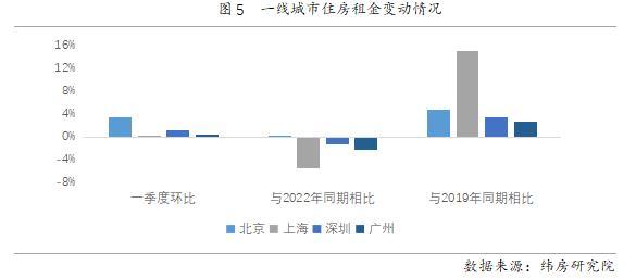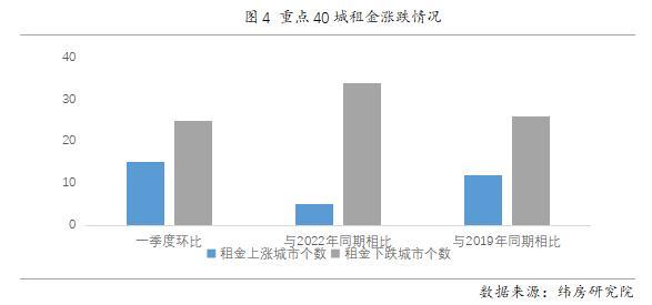 從租金水平來看,緯房研究院數據顯示,一季度重點40城中15個城市住房租金環比小幅上漲,25個城市住房租金環比下跌。與2022年一季度相比,僅有5個城市住房租金同比上漲,其餘34個城市住房租金同比下降。