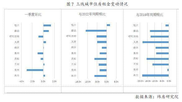 三線城市(貴陽、南寧、蘭州、銀川、煙臺、太原、惠州、廊坊、常州、呼和浩特。)一季度住房租金呈現分化態勢。重點40城中10個三線城市,一季度住房租金漲跌參半。其中,銀川、廊坊、太原、蘭州、南寧和煙臺租金微漲,常州、惠州、呼和浩特和貴陽租金微跌。與去年同期相比,銀川住房租金同比上漲,其餘城市下跌。其中,廊坊住房租金跌幅爲10.85%。