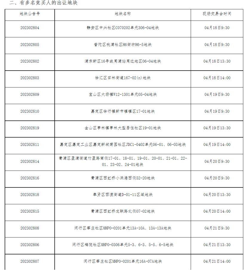 通知顯示,今年上海第一批次集中供地的現場交易活動將於4月18日起舉行,此次出讓的19幅地塊中有4幅地塊僅一名競買人報名,或將底價成交。其餘15幅地塊獲得多名競買人報名,將於4月18日至4月21日出讓。