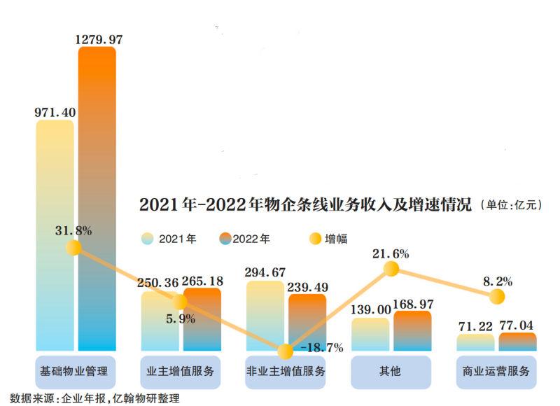 億翰智庫指出,2022年已披露增值服務數據的44家物企總收入爲265.18億元,相較於2021年的249.77億元增長6.2%,總營收佔比達到13.1%,業主增值服務超越非業主增值服務,成爲物企第二增長曲線。