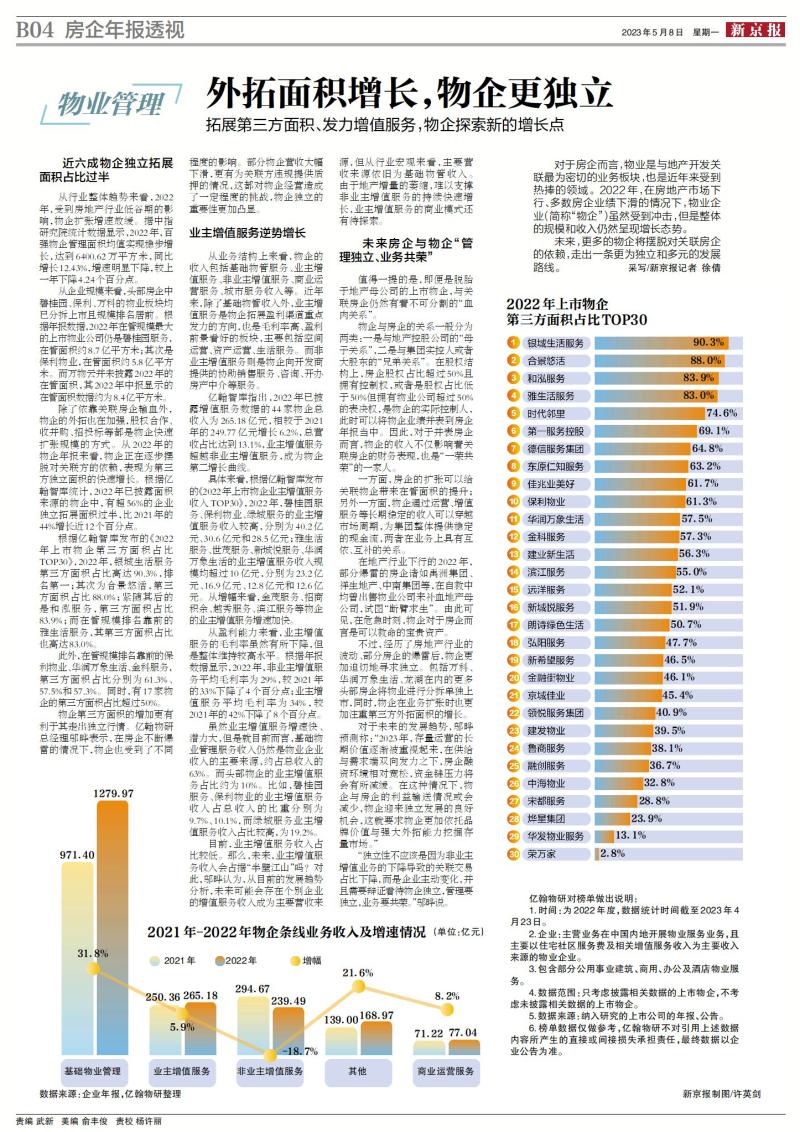 對於房企而言,物業是與地產開發關聯最爲密切的業務板塊,也是近年來受到熱捧的領域。2022年,在房地產市場下行、多數房企業績下滑的情況下,物業企業(簡稱“物企”)雖然受到衝擊,但是整體的規模和收入仍然呈現增長態勢。