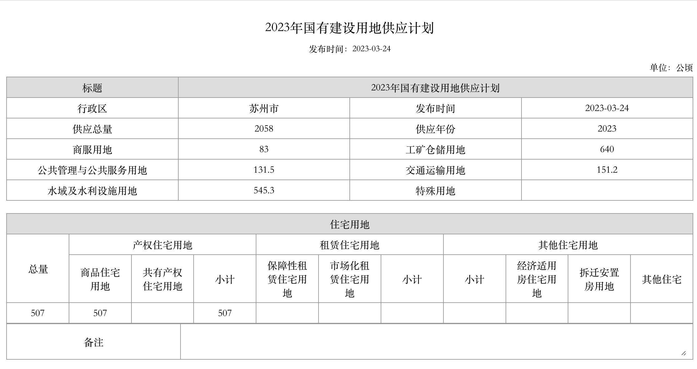 根據蘇州此前公佈的2023年國有建設用地供應計劃,蘇州今年供應總量爲2058公頃,其中住宅用地總量爲507公頃,佔供應計劃的24.64%,全部爲商品住宅用地。與2022年計劃供應商品住宅用地97.1411公頃相比,增加421.92%。