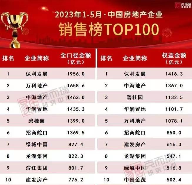 在上述兩家機構最新出爐的房企銷售業績(全口徑)排行榜上,今年前5個月房企銷售額排名延續了前4個月的位次,保利發展、萬科、中海地產仍然位居前三名,“保萬海”的格局進一步穩固。