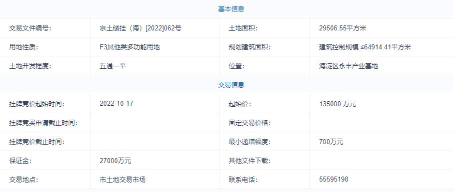 京土儲掛(海)[2022]062號爲北京市海淀區西北旺鎮永豐產業基地(新)HD00-0403-001地塊,土地面積爲2.95萬平方米,建築控制規模≤6.49萬平方米,出讓年限方面,該地塊商業40年、辦公50年,起始價爲13.5億元。