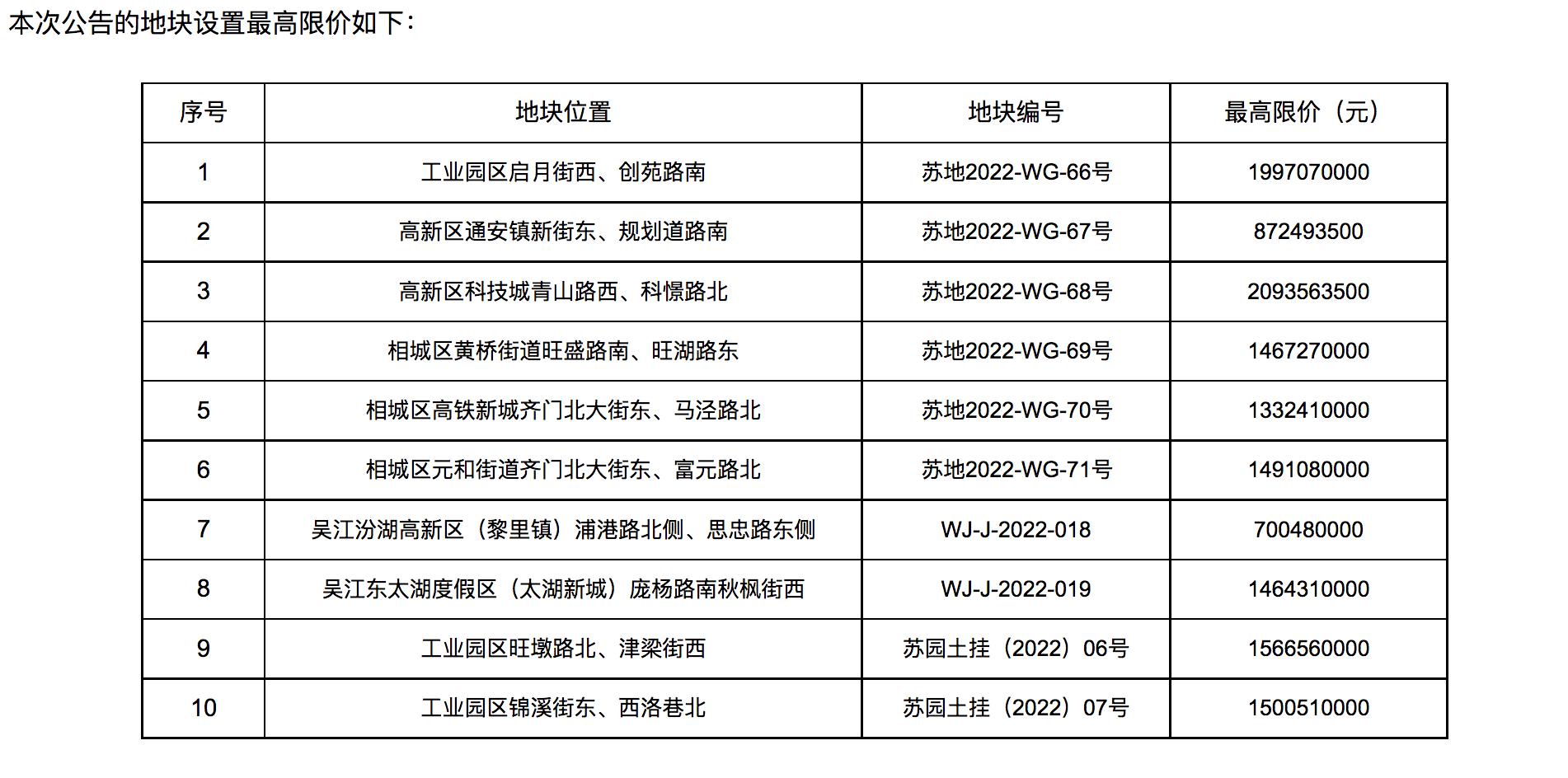 11月4日,江蘇省蘇州市自然資源和規劃局發佈《蘇地網掛〔2022〕11號 蘇州市區國有建設用地使用權網上掛牌出讓公告》,第五批次集中供地共推出10宗地塊,總出讓面積50.77萬平方米,起拍總價爲125.98億元,並將於12月5日進行限時競價。