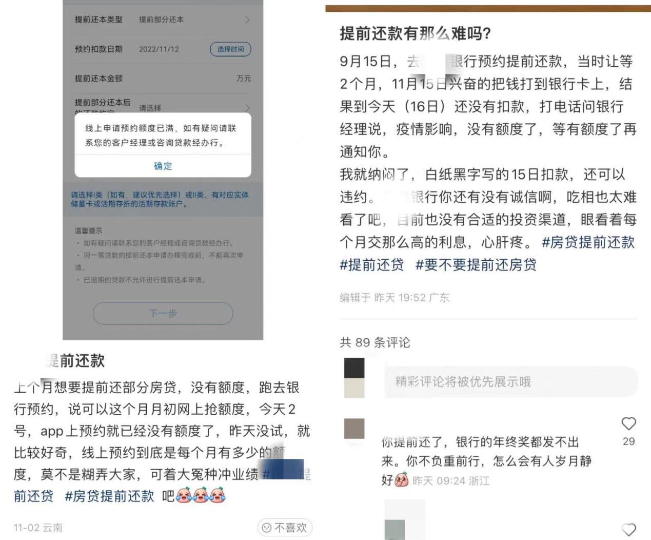 今年,“提前還貸”成爲一個熱詞。像張瑩一樣選擇提前還房貸的貸款人有不少,隨之而來的還貸難也成爲一個新的問題。中新經緯在某社交平臺上看到,不少貸款人吐槽銀行提前還貸時遇到困難,有的貸款人只能預約到明年3月份,還有人不得不向監管投訴才得以順利還貸。