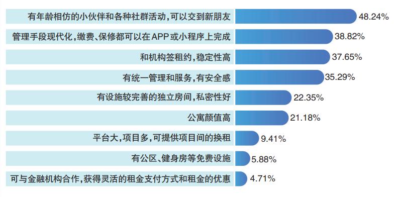談及租住體驗,小馬很是滿意:“私密空間強,又能與較熟的朋友相約一起看書、健身。遇到節日,社區裏還會舉辦小型活動,有家的感覺。此外,這裏的設施比較完善,在安全、服務、衛生等方面都有保障。”小馬的感受並非個例。ICCRA住房租賃產業研究院(簡稱“ICCRA”)調研發現,近半數的青年人認爲,可以通過公寓舉辦的社羣活動結交新朋友;超過三成的青年人認爲租住體驗便捷、租約穩定、且統一管理有安全感。