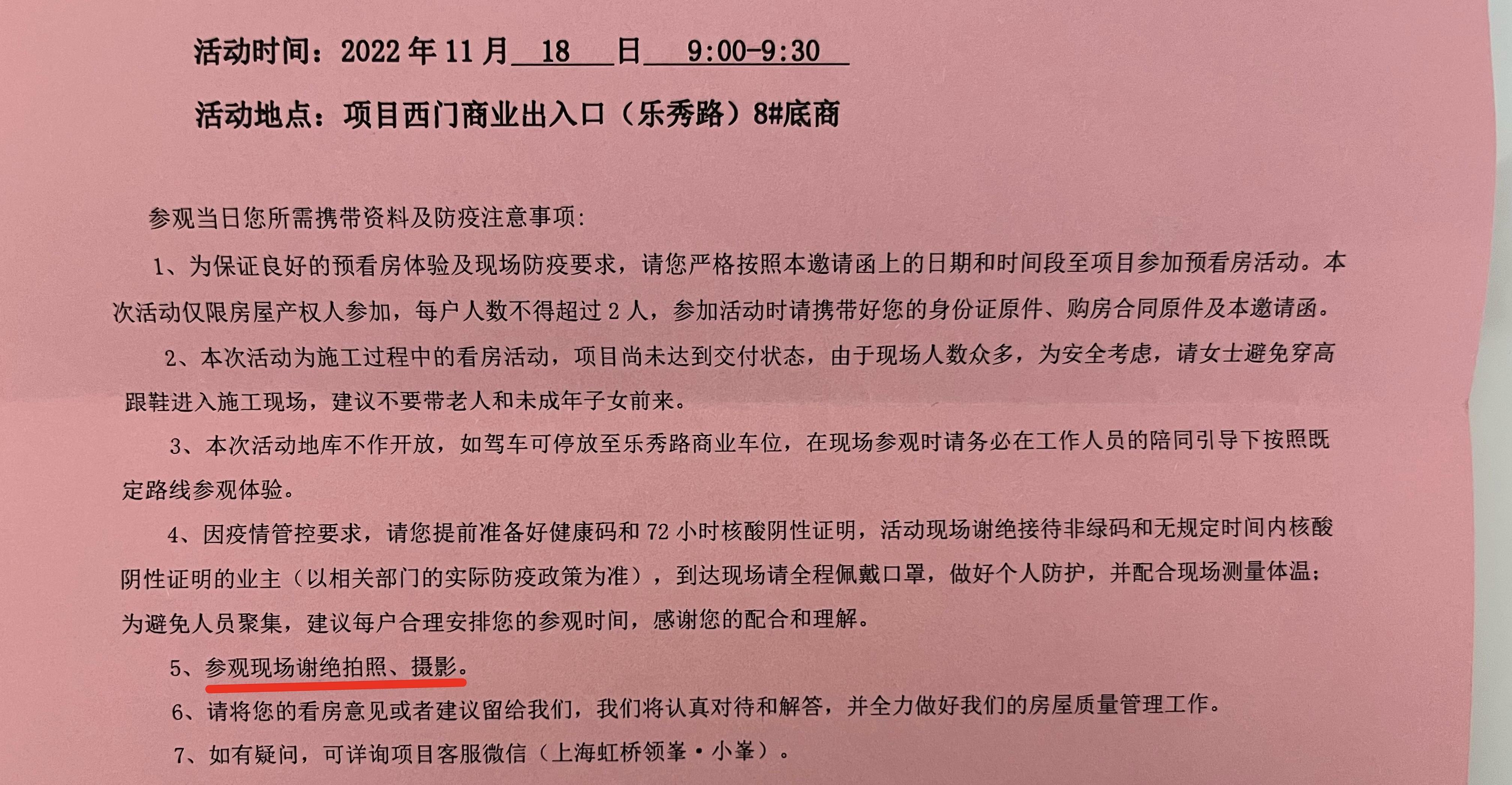 林清介紹,他於11月13日收到開發商寄來的邀請函。其中提到,項目施工接近尾聲,誠邀參加“預看房”活動,時間爲11月18日9點-9點30分。僅限房屋產權人,每戶人數不得超過2人,地庫不作開放,且謝絕拍照、攝影。