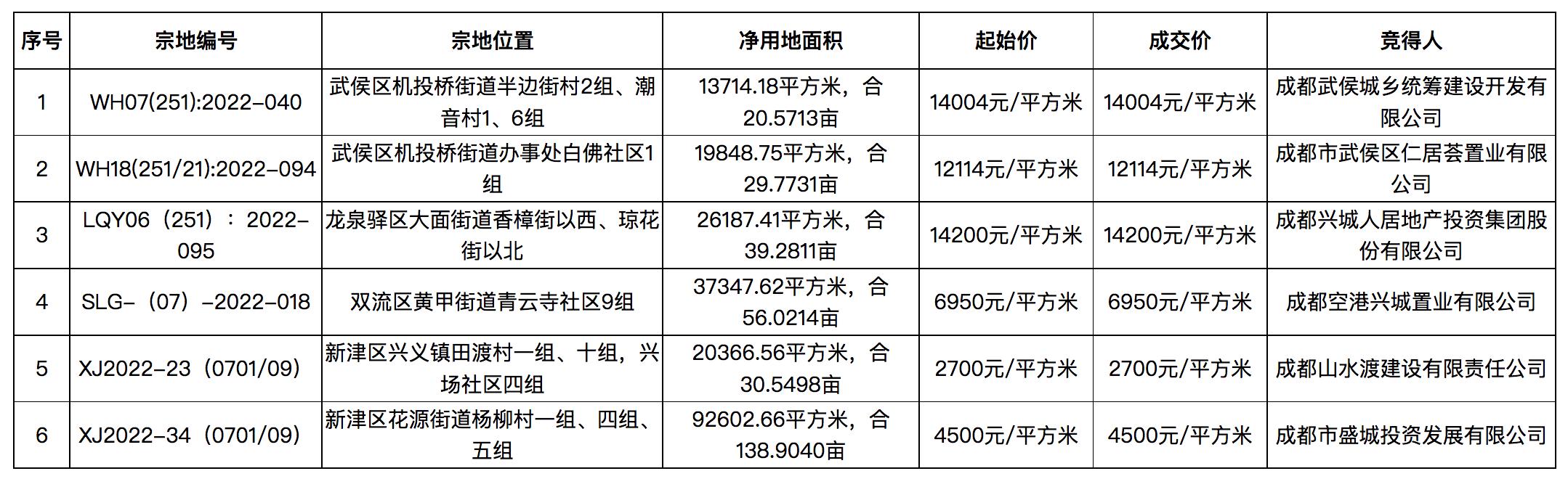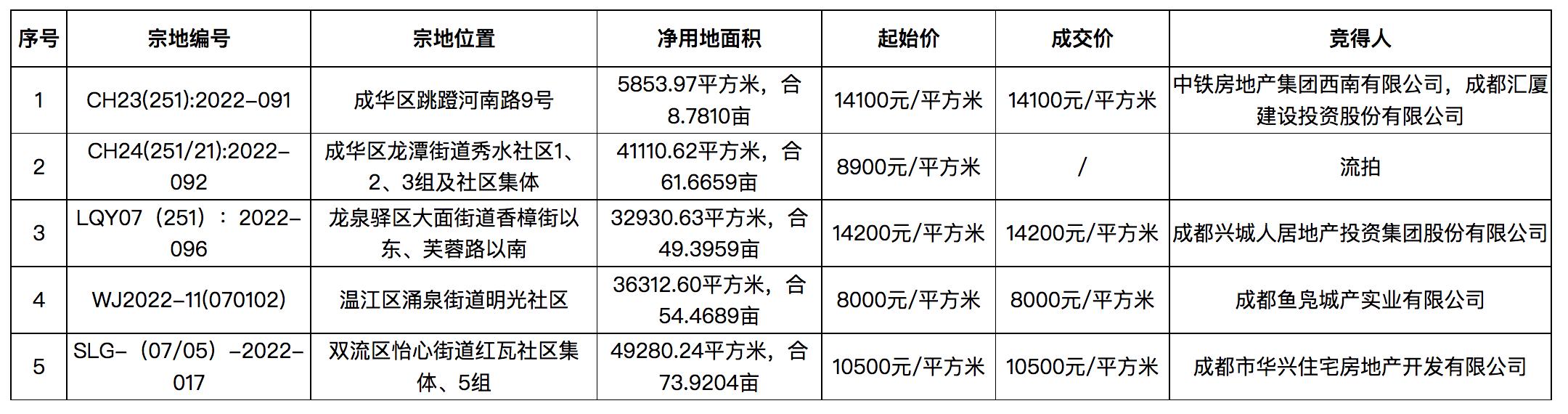 另外14宗地塊均以底價成交。其中,本批次宗地限定房價(清水)超過3萬元/平方米的另一宗地塊爲高新區桂溪街道銅牌村9組、10組地塊,該地塊淨用地面積26187.4平方米(合39.2811畝),起拍總價80526萬元,宗地限定房價32000元/平方米。按照成交結果,該地塊由成都高投置業有限公司底價競得,成交單價15375元/平方米。