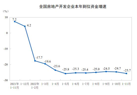 房企到位資金是衡量開發投資的重要指標。今年1-11月份,房地產開發企業到位資金約13.63萬億元,同比下降25.7%。其中,國內貸款約1.58萬億元,同比下降26.9%;利用外資66億元,同比下降26.6%;自籌資金約4.9萬億元,同比下降17.5%;定金及預收款約4.46萬億元,同比下降33.6%;個人按揭貸款約2.19萬億元,同比下降26.2%。