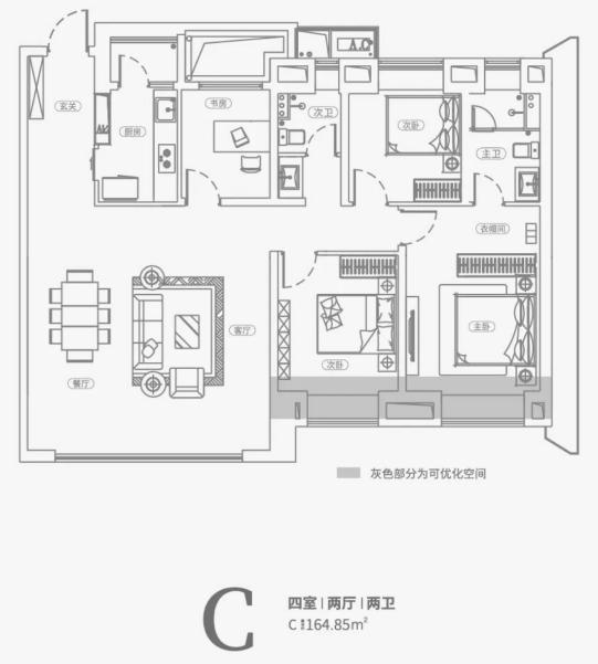 建面約164㎡朗闊四室,約6.5m一體化大橫廳,超寬視野無遮瞰江;雙向陽臺,收攬園林江景,依園傍水置業一步到位。