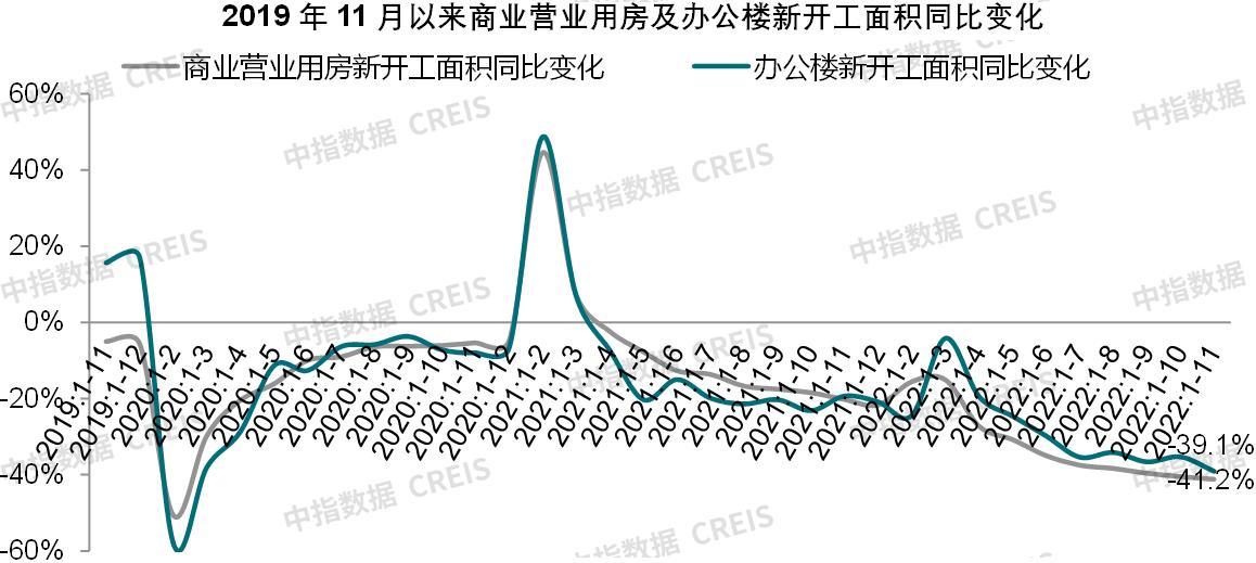 11月份,全國商業營業用房開發投資額爲9845億元,同比下降14.5%,降幅較上年同期擴大11.5個百分點;新開工面積爲7608萬平方米,同比下降41.2%,降幅較上年同期擴大20.9個百分點。