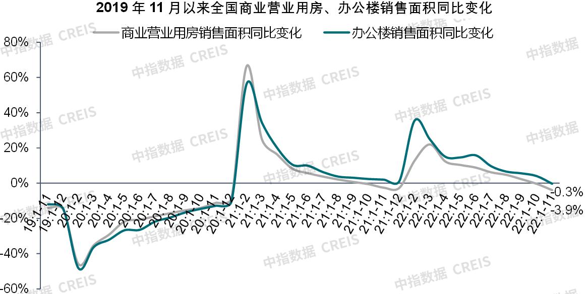 中指研究院發佈的最新報告顯示,2022年1-11月份,全國商業營業用房銷售面積爲7234萬平方米,同比下降3.9%;辦公樓銷售面積爲2820萬平方米,同比止增轉降,下降0.3%,二季度以來單月增速轉負。寫字樓租賃方面,重點城市主要商圈的租金連續三個季度下跌,其中三季度跌幅爲0.17%。