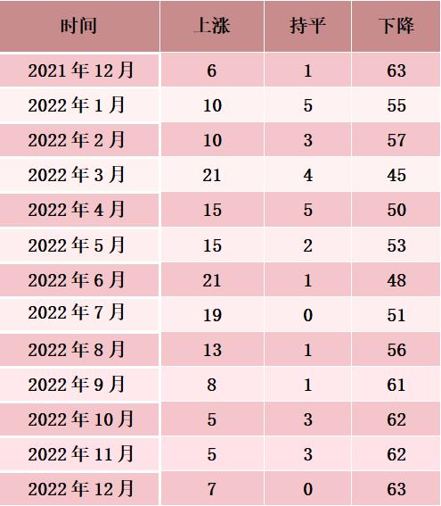 2022年12月份,70個大中城市中商品住宅銷售價格下降城市個數有所增加,各線城市商品住宅銷售價格環比持平或下降,一線城市同比上漲、二三線城市同比下降。