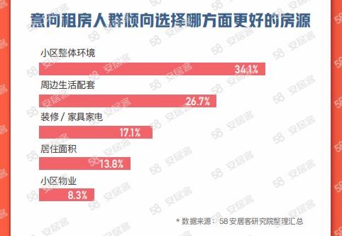 報告顯示,在預算有限的情況下,有34.1%的意向租房人羣更希望選擇小區整體環境更好的房源;有26.7%的意向租房人羣更注重周邊生活配套,17.1%的人羣希望租住房源中能有更好的裝修/傢俱家電。