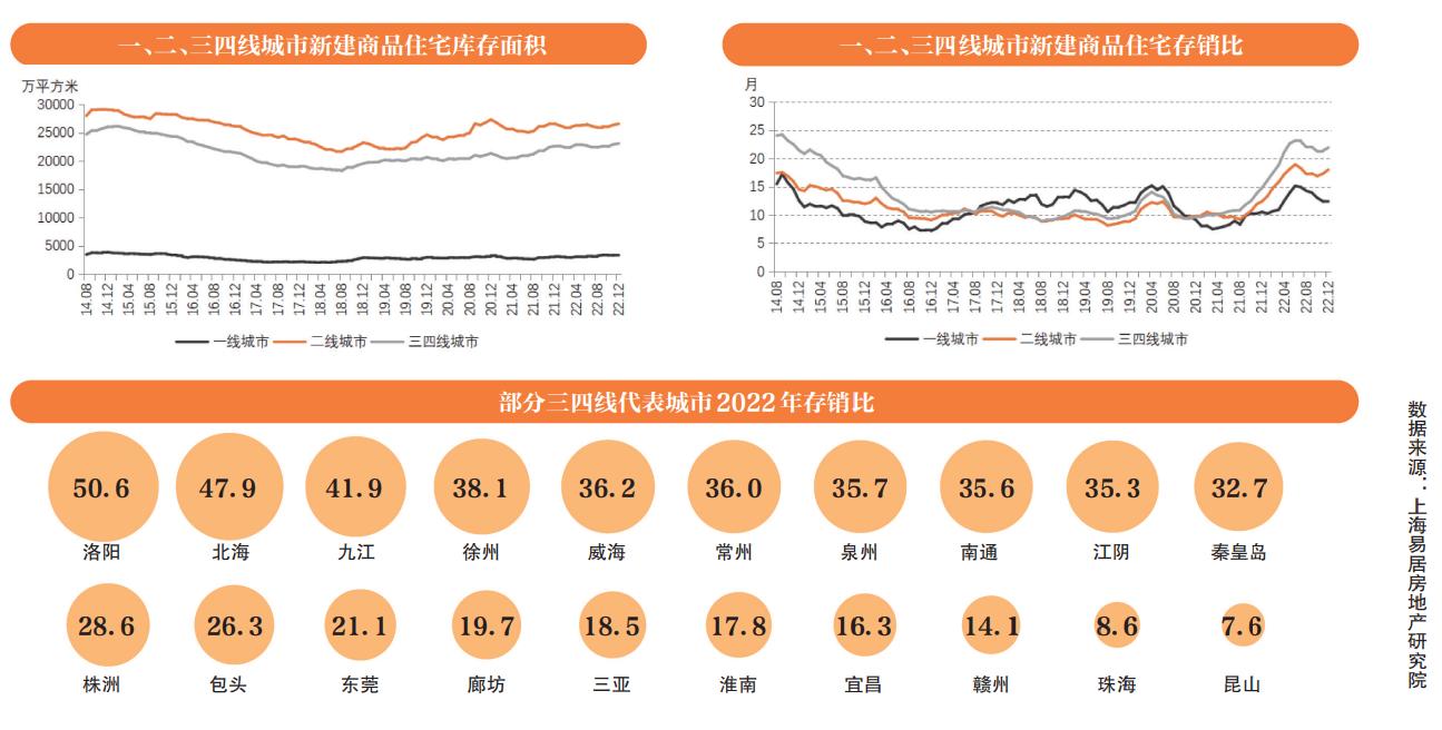 對此各線城市也可以看出,目前三四線城市庫存較高,去庫存壓力較大。據上海易居房地產研究院數據顯示,2022年底,100個城市中一、二、三四線的新建商品住宅存銷比分別爲12.4、18.0和21.9個月。總體上,一線城市去化週期相對較好,二線城市居中,而三四線城市最大。
