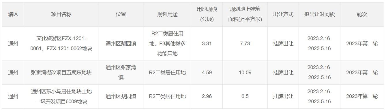 2月17日,北京市規劃和自然資源委員會發布“擬供應商品住宅用地清單(2023年第一輪)”,本次清單中項目共計23宗,涉及9個區,土地面積約103公頃,擬出讓時間段爲2月16日至5月16日。