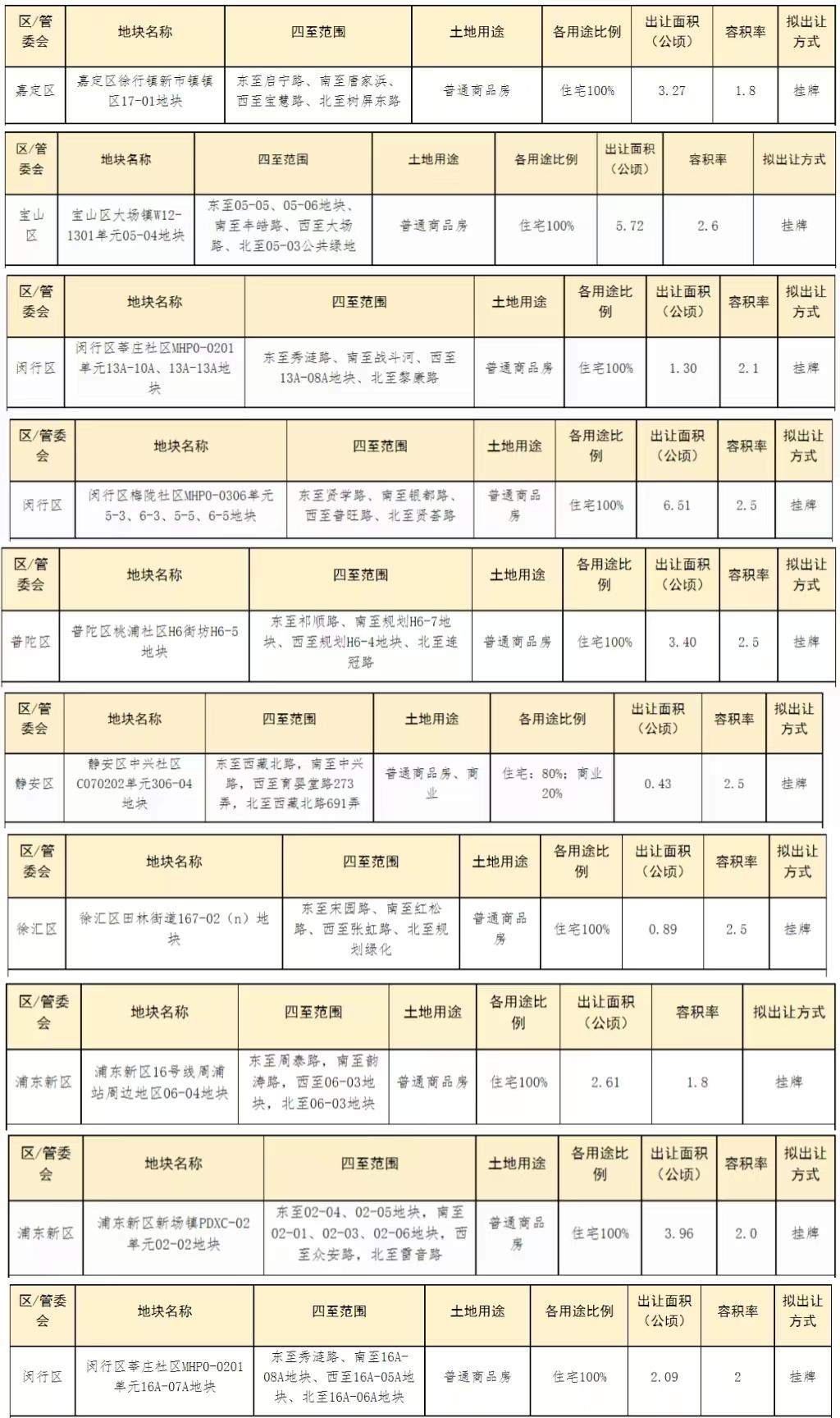 從區位上看,閔行區、嘉定區、青浦區均推出3宗住宅用地;浦東新區、奉賢區分別推出2宗住宅用地;徐彙區、靜安區、普陀區、寶山區、松江區、金山區各1宗。