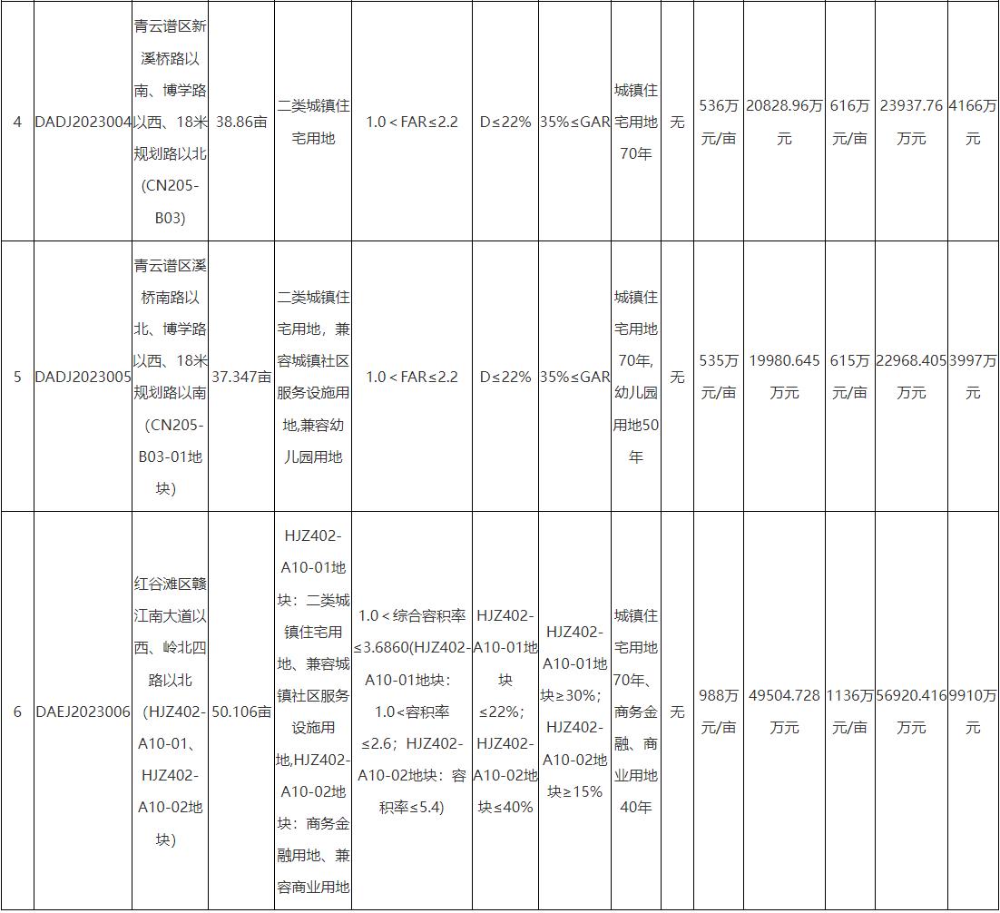 6幅宅地均來自南昌市市本級2023年第一批擬出讓住宅用地清單,分別位於高新區(1幅)、西湖區(2幅)、青雲譜區(2幅)以及紅谷灘區(1幅),總用地面積269.1865畝,起始總價約21.55億元。