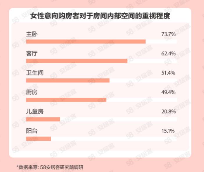 除了重視選房的外部因素外,在考察房屋的戶型時,女性購房者也追求舒適和便捷的居住體驗,注重主臥及客廳部分的舒適程度,其中有73.7%更爲注重主臥。此外,分別有51.4%和49.4%的女性對廚房的設計和佈局,衛生間的通風、乾溼分離等細節更爲重視,選擇這兩項的女性購房者佔比均高於男性,表明女性在購房時更爲追求有品質的生活方式。