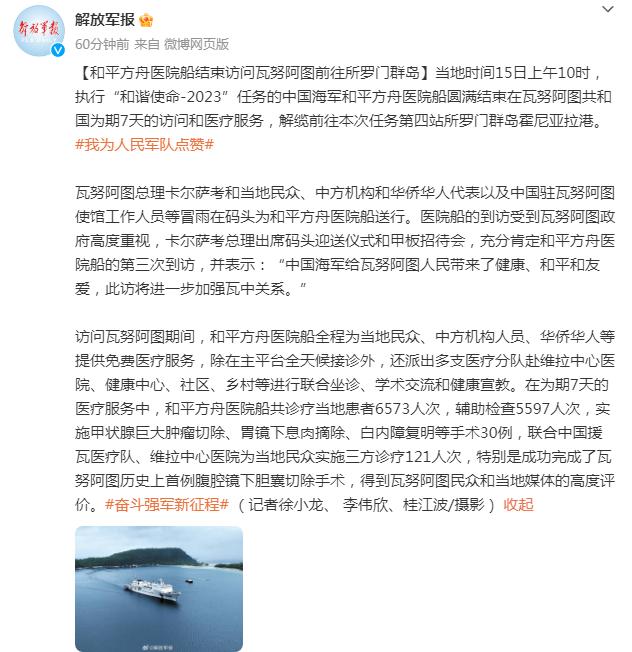 當地時間15日上午10時,執行“和諧使命-2023”任務的中國海軍和平方舟醫院船圓滿結束在瓦努阿圖共和國爲期7天的訪問和醫療服務,解纜前往本次任務第四站所羅門羣島霍尼亞拉港。