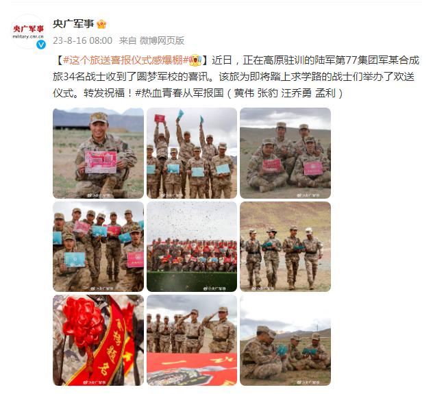 近日,正在高原駐訓的陸軍第77集團軍某合成旅34名戰士收到了圓夢軍校的喜訊。該旅爲即將踏上求學路的戰士們舉辦了歡送儀式。轉發祝福!(黃偉 張豹 汪喬勇 孟利)