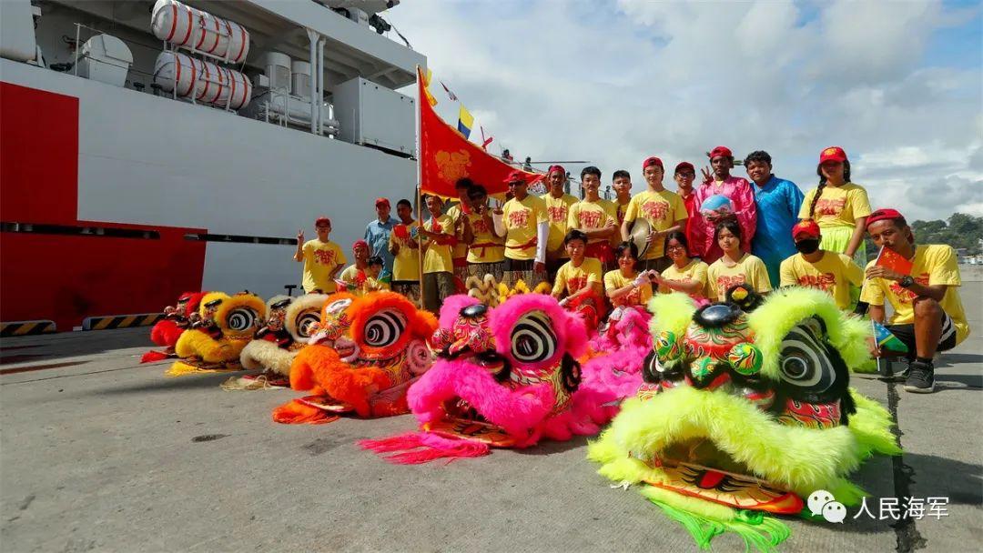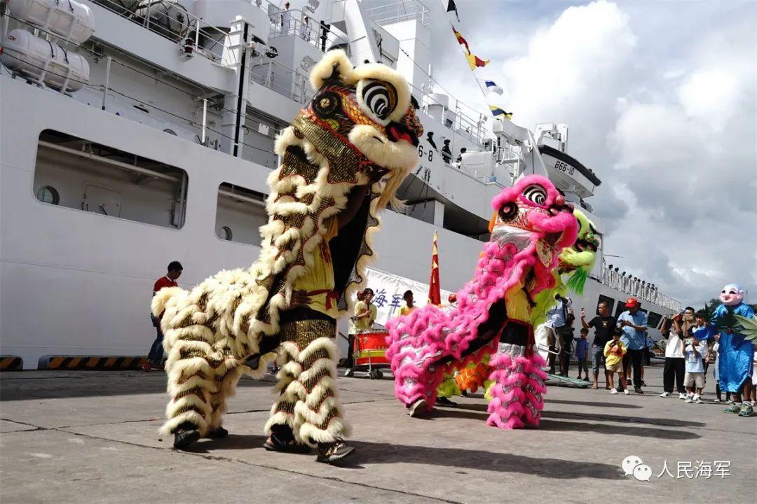 ▲圖爲所中商會舞獅表演隊歡迎中國海軍官兵的到來。徐小龍 攝