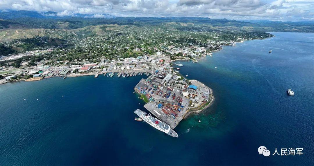 ▲圖爲和平方舟號醫院船靠泊霍尼亞拉。桂江波 攝