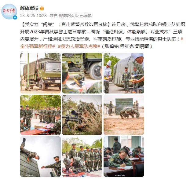 連日來,武警甘肅總隊白銀支隊組織開展2023年夏秋季警士選晉考覈,圍繞“理論知識、體能素質、專業技術”三項內容展開,嚴格選拔思想政治堅定、軍事素質過硬、專業技能精湛的警士隊伍!(張倚銘 程紅光 司晨曦)