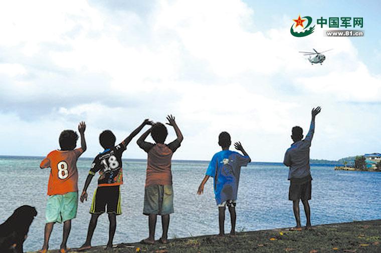 25日下午,直升機再次盤旋在小島上空,醫療分隊隊員踏上歸程。許多民衆紛紛趕來,朝着隊員們揮手道別,一羣孩子跟着直升機的航向奔跑……