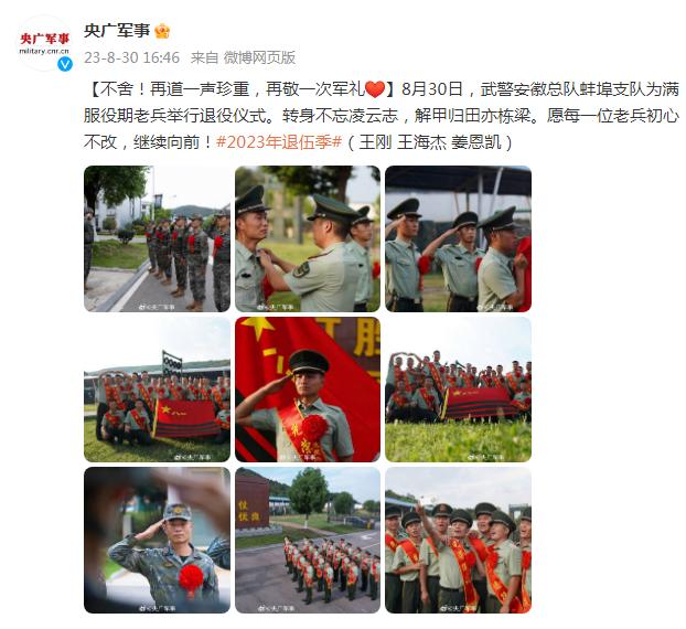 8月30日,武警安徽總隊蚌埠支隊爲滿服役期老兵舉行退役儀式。轉身不忘凌雲志,解甲歸田亦棟樑。願每一位老兵初心不改,繼續向前!(王剛 王海傑 姜恩凱)