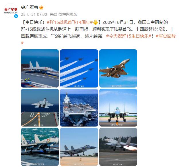 2009年8月31日,我國自主研製的殲-15艦載戰鬥機從跑道上一躍而起,順利實現了陸基首飛。十四載劈波斬浪,十四載磨礪玉成,“飛鯊”越飛越高、越來越強!今天祝殲-15生日快樂!