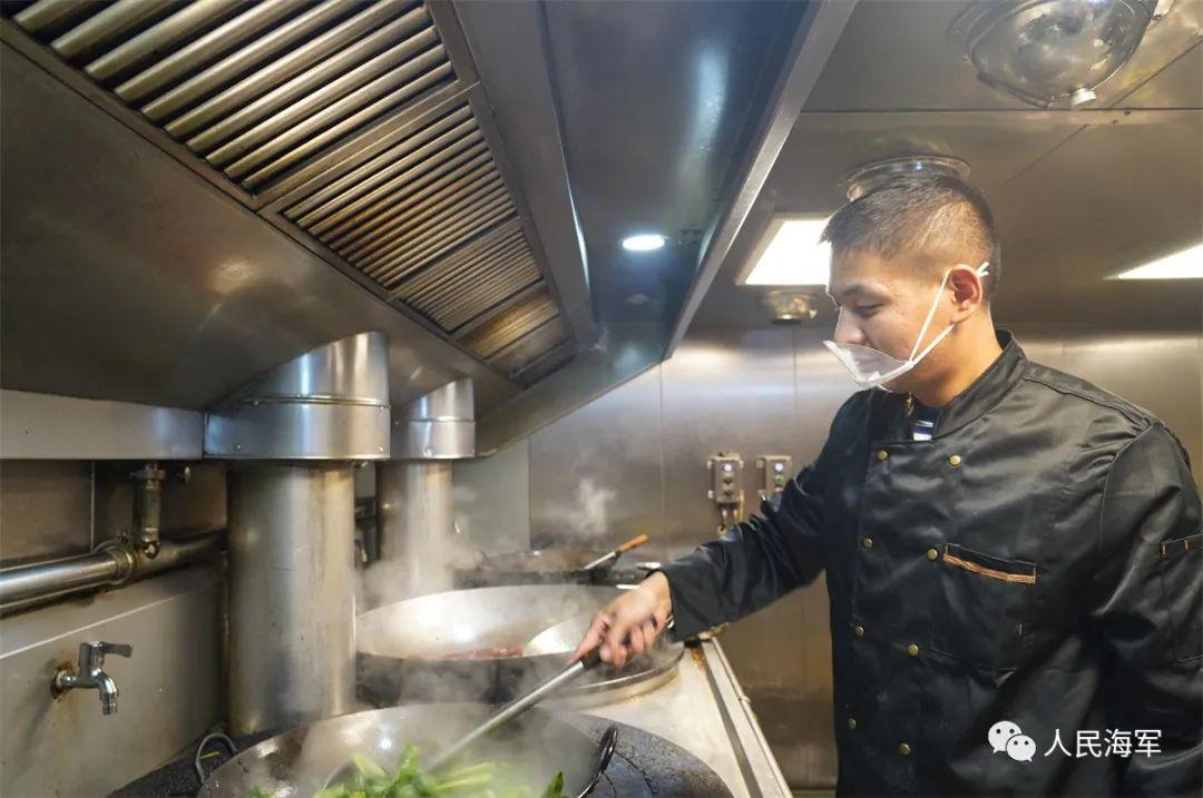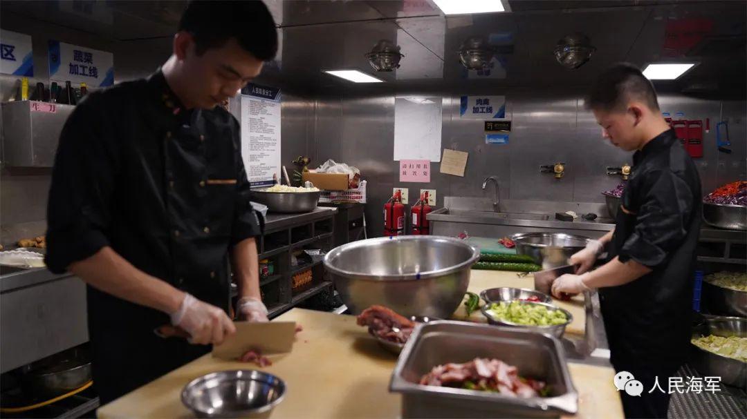 每晚十點,炊事班的戰友們保障完全艦官兵的一日三餐,還要繼續忙碌着爲夜間執勤的戰友烹飪夜餐。