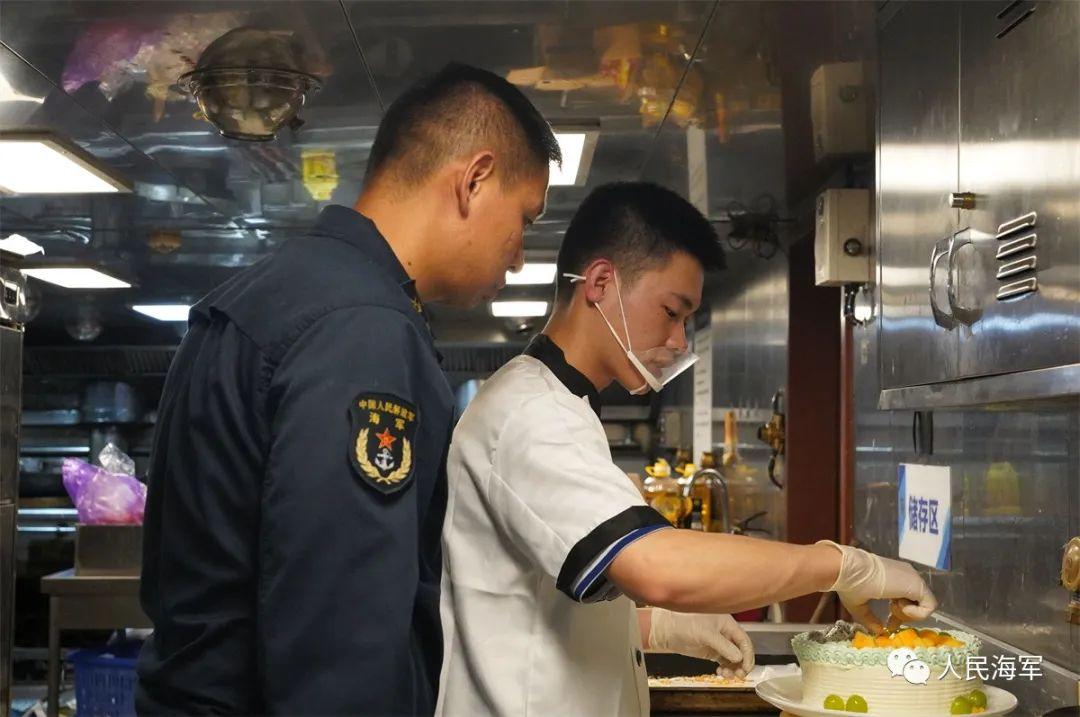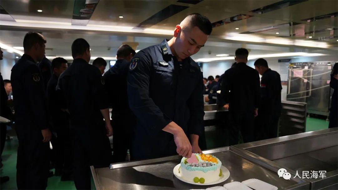 當晚,他們要爲航渡期間過生日的帆纜班班長孫櫟淏準備一份“小驚喜”——一個小蛋糕和一碗長壽麪。前來喫夜餐的官兵們,紛紛向“壽星”送上“浪花”般的祝福。