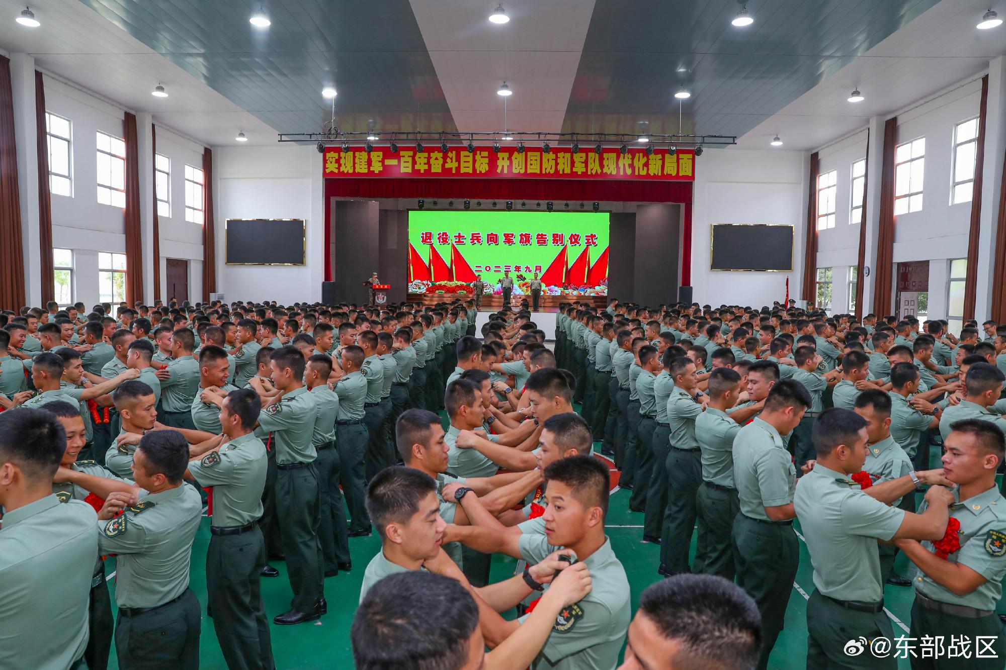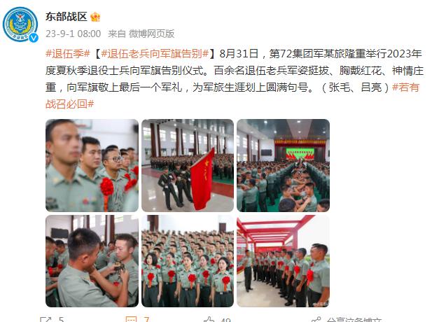 8月31日,第72集團軍某旅隆重舉行2023年度夏秋季退役士兵向軍旗告別儀式。百餘名退伍老兵軍姿挺拔、胸戴紅花、神情莊重,向軍旗敬上最後一個軍禮,爲軍旅生涯劃上圓滿句號。(張毛、呂亮)