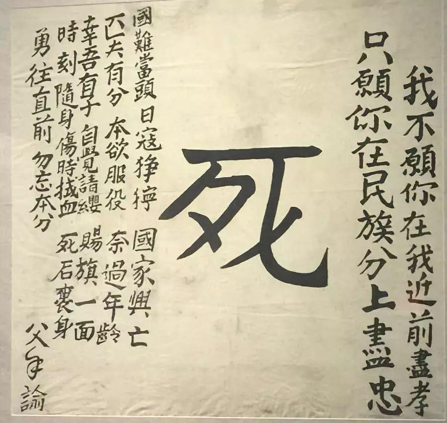 △一名抗日戰士出征前,父親贈送他的“死字旗”。