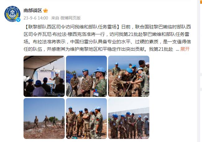 日前,聯合國駐黎巴嫩臨時部隊西區司令喬瓦尼·布拉法·穆西克洛准將一行,訪問我第21批赴黎巴嫩維和部隊任務雷場。布拉法准將表示,中國掃雷分隊具備專業的水平、過硬的素質,是一支值得信任的隊伍,並感謝其爲維護南黎地區和平穩定作出突出貢獻。我第21批赴黎維和多功能工兵分隊部署至任務區以來,已累計清排雷場面積14000餘平方米,安全排除地雷2000餘枚,以實際行動踐行“忠實履行使命,維護世界和平”的莊嚴承諾。(張哲、李竹林)