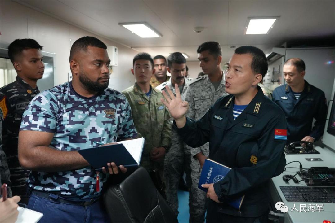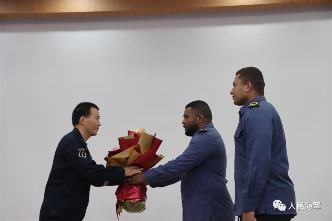 隨艦混編同訓的斐濟海軍學員蘭格力,曾在海軍工程大學留學,他爲母校老師獻上一捧鮮花。這束鮮花從起航開始,就一直被悉心照料,保持着新鮮,直到節日這天才送到教員手中。