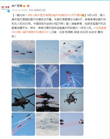 9月14日,第六屆中國天津國際直升機博覽會開幕。本屆天津直博會爲期4天,參展參演的直升機和無人機共65架。中國陸軍共安排14型79架(套)裝備參展,包括多型直升機及配套武器平臺,其中,將首次展示寬體運輸直升機和察打一體無人機。(記者:王苗 耿順乾 胡濤 朱東陽 狄伯文 曹克俊)