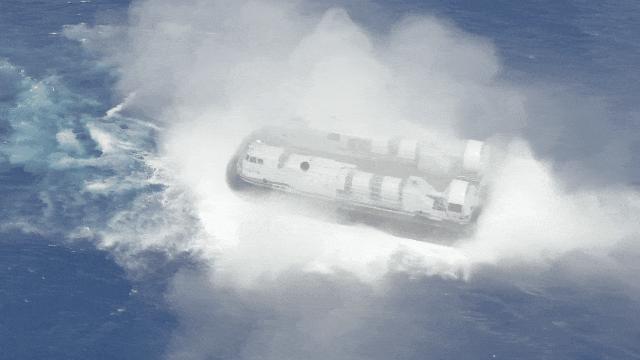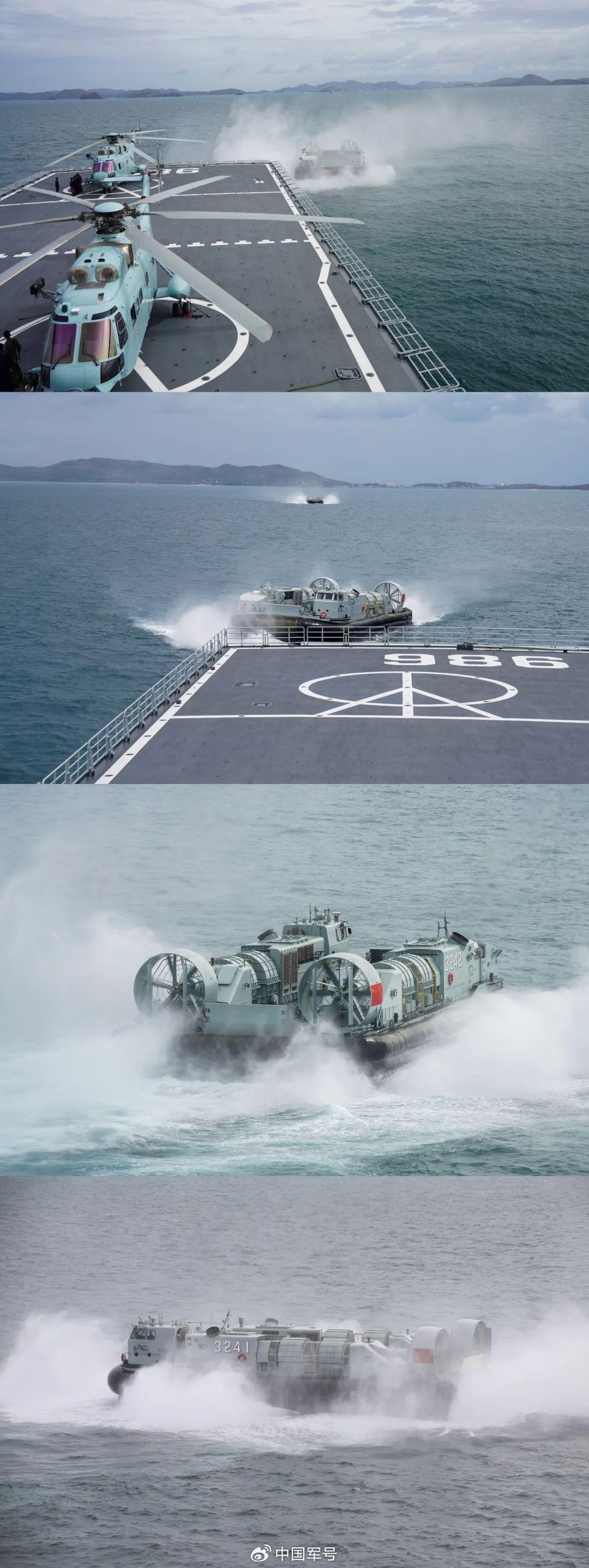 ▽四明山艦艉門打開後,氣墊艇在水霧中駛出塢艙