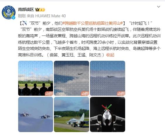 “計時起飛!”“雙節”前夕,南部戰區空軍航空兵某機場十數架戰機接續起飛,伴隨着虎嘯龍吟般的轟鳴聲,一場晝夜兼程、跨越山海的遠程機動訓練拉開戰幕。此次遠程機動訓練航程達數千公里,飛越多個省市,時間跨度20餘小時,以實戰化背景穿插設置陌生空域突防突擊、下半夜陌生機場起降、海上遠程長航時突擊、島礁起降等多個高難度科目訓練。(曲笛、黃玉珏、王猛、陸文傑)