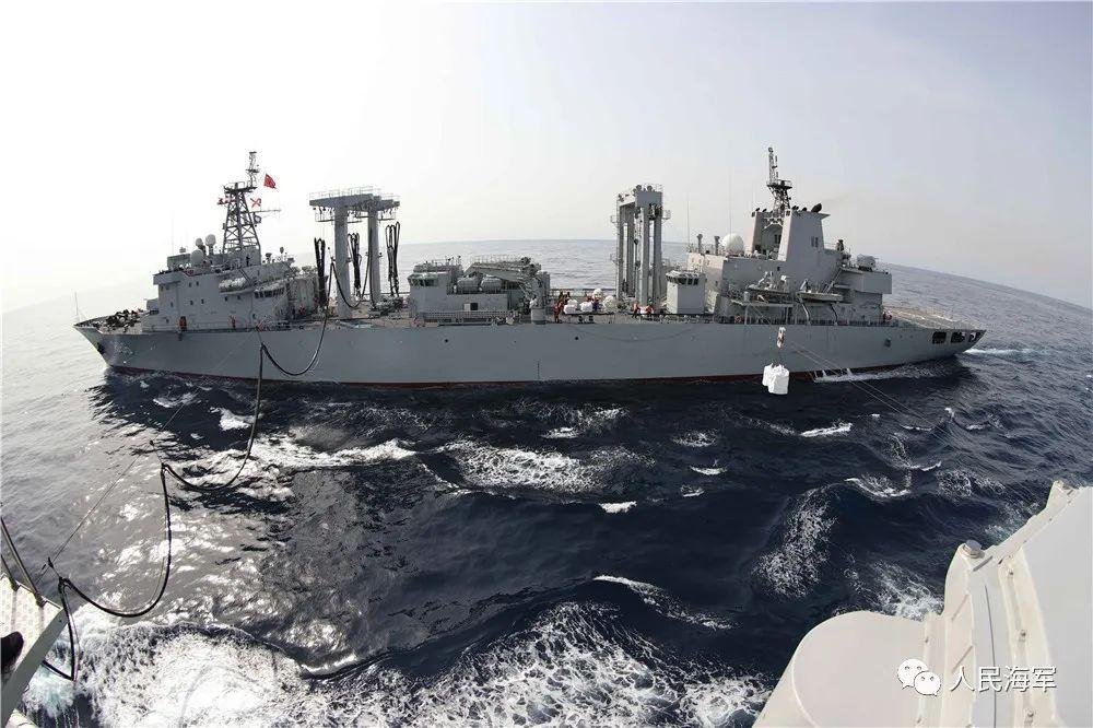 ▲第44批護航編隊淄博艦接受千島湖艦乾貨補給。