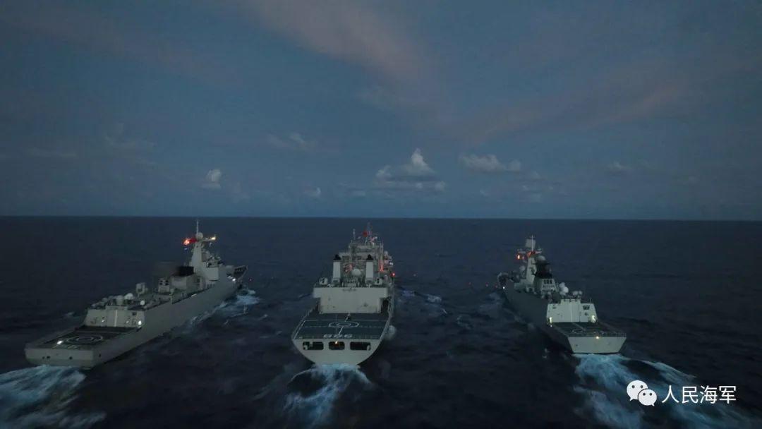 ▲第44批護航編隊三艦進行夜間橫向液貨補給
